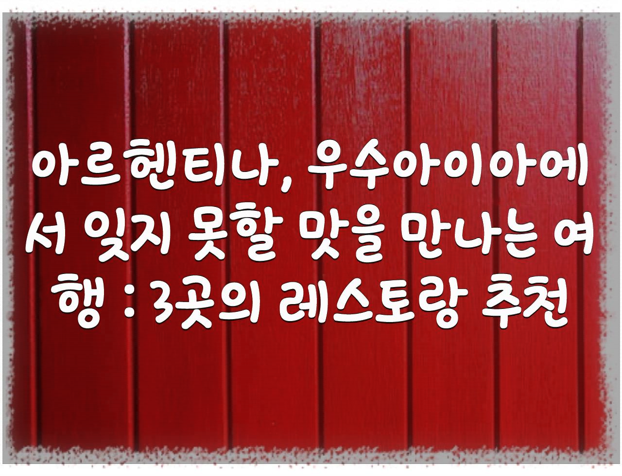 정리드린 글은 아르헨티나, 우수아이아에서 잊지 못할 맛을 만나는 여행 : 3곳의 레스토랑 추천 입니다. 상기 글이 좋은 정보가 되셨길...